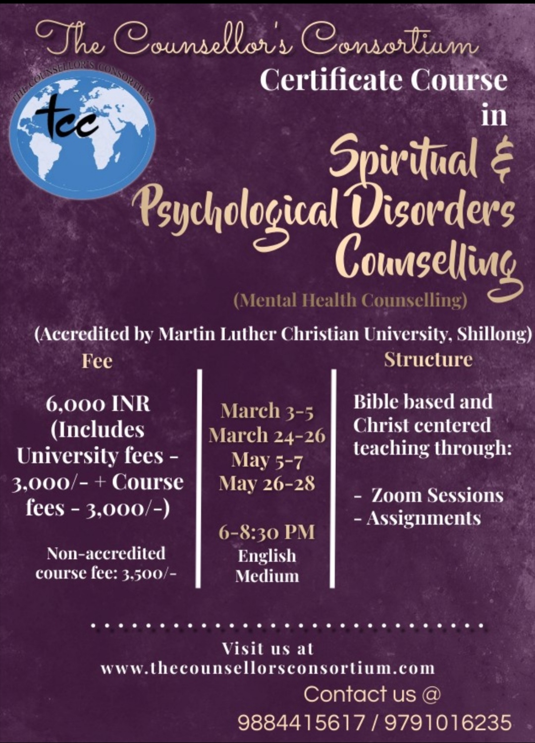 | Certificate Course in Spiritual and Psychological Disorders Counselling : | Foundation Course Part 1: March 3-5, 2022 Subject Course Part 1: March 24-26, 2022 Foundation Course Part 2: May 5-7, 2022 Subject Course Part 2: May 26-28, 2022 |