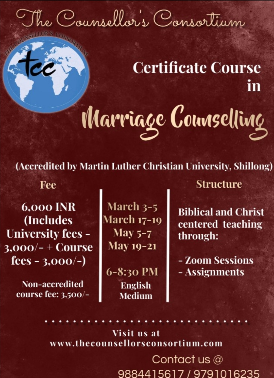| Certificate Course in Marriage Counselling: | Foundation Course Part 1: March 3-5, 2022 Subject Course Part 1: March 17-19, 2022 Foundation Course Part 2: May 5-7, 2022 Subject Course Part 2: May 19-21, 2022 |